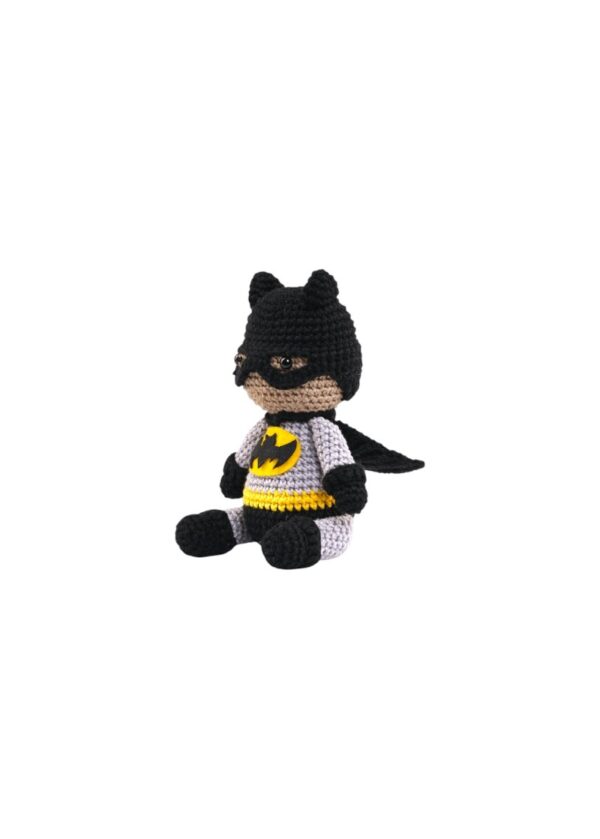 Hand-crocheted with love and care, this brave little hero is suited up in his classic black and grey outfit, complete with the iconic bat emblem. With his tiny mask, pointy ears, and fearless spirit, he’s ready to watch over your little one’s adventures — day or night!