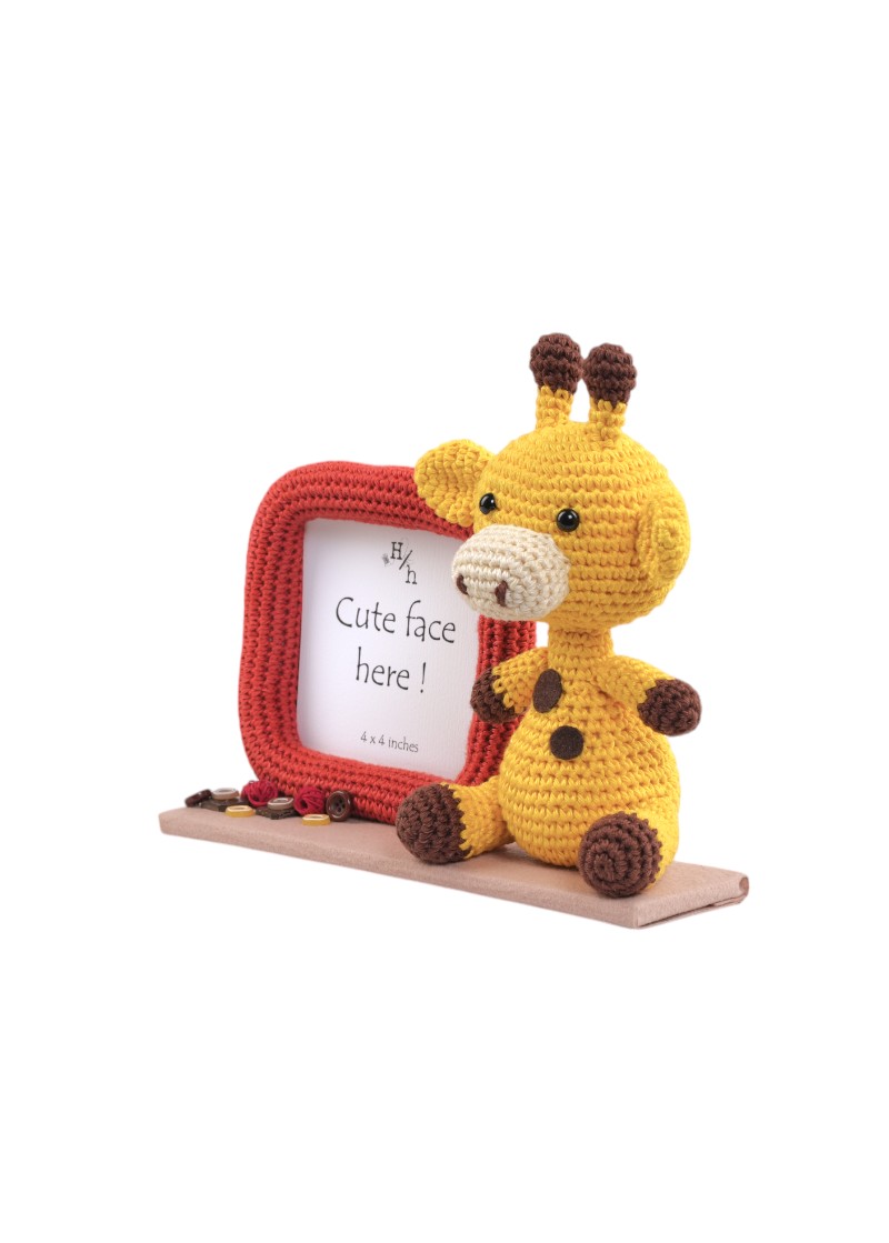 The giraffe’s charming expression, tiny horns, spots and buttons make it an instant favorite for little ones and grown-ups alike.Lovingly crafted with premium quality yarn, this one-of-a-kind piece features a cheerful giraffe cuddled up next to a rust frame—ready to showcase your most treasured 4×4 inch photo.