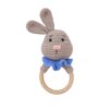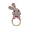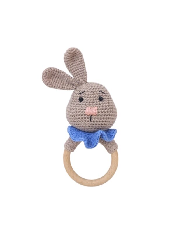 Lovingly handcrafted from the softest cotton yarn, this adorable bunny features floppy ears, a rosy pink nose, a cute ruffled collar and a smooth wooden ring — perfect for tiny hands to grasp and shake.