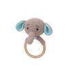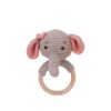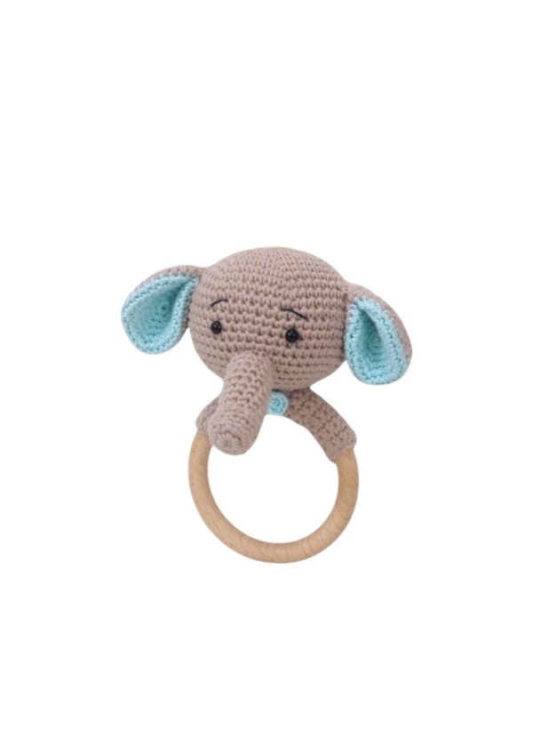Carefully handcrafted from soft cotton yarn, this lovable little elephant features adorable floppy ears, a dainty bow, and a smooth wooden ring — just the right size for tiny fingers to grip and shake.