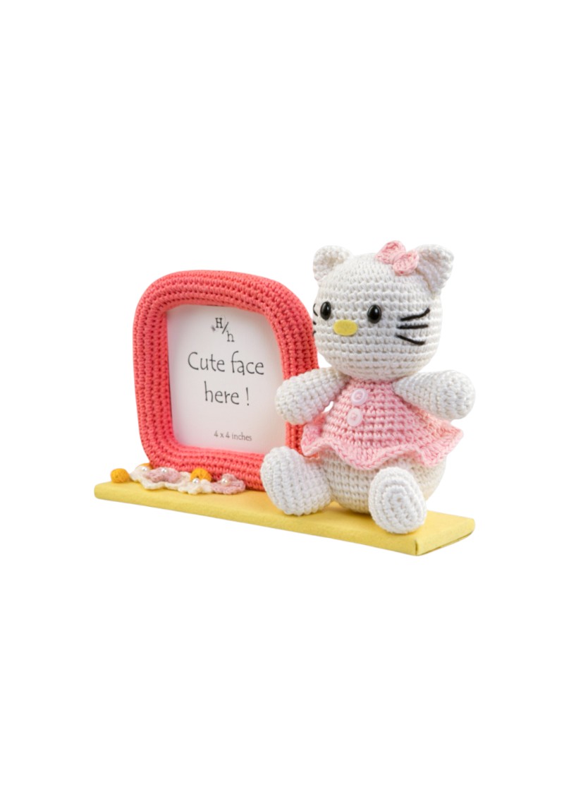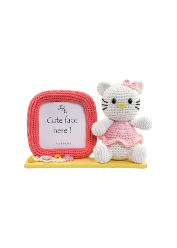 Featuring a charming coral frame and an irresistibly cute crocheted kitty dressed in a pastel pink dress and bow with decorative accents like mini crochet flowers on a vibrant yellow base.
