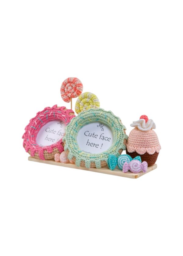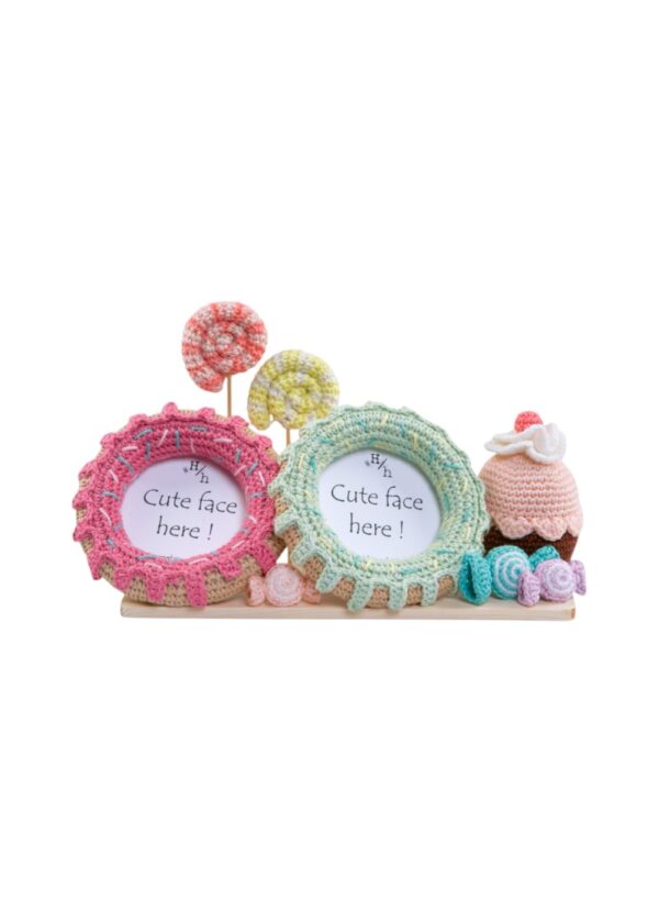 This pastel colored frame is a scrumptious candy land of hand-crocheted candies, lollipops, and a scrumptious cupcake – all lovingly stitched to perfection.